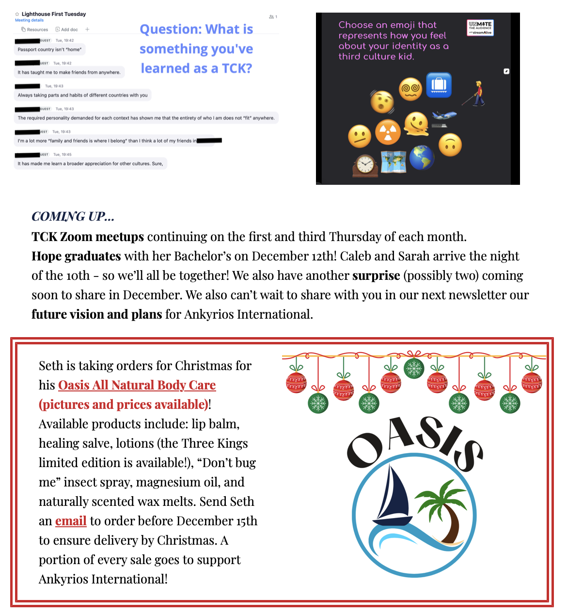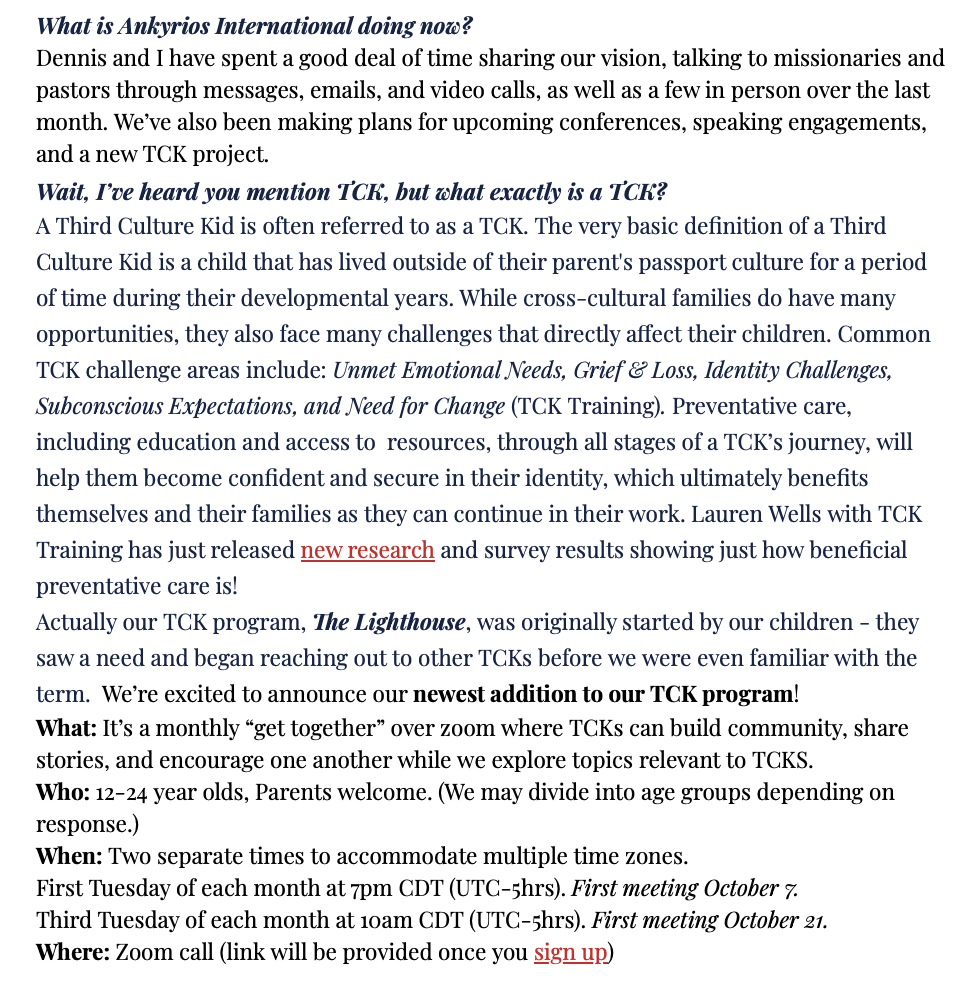 Coming soon! We are so excited to offer a weekend retreat for ATCKs, ages 18-25.